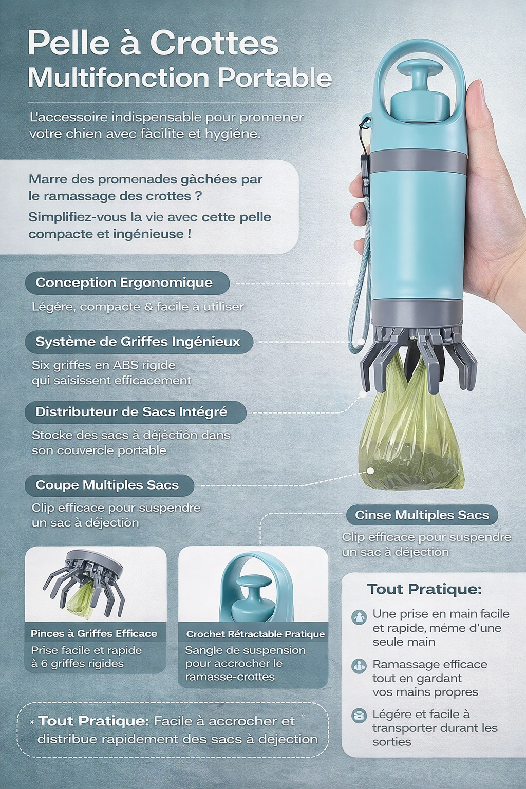 Vous en avez assez des promenades gâchées par le ramassage des déjections de votre chien ? Simplifiez-vous la vie avec cette pelle à excréments innovante, pensée pour allier propreté, praticité et efficacité. Grâce à son système de griffes ingénieux et son design ergonomique, elle permet de ramasser rapidement et sans effort, tout en gardant les mains propres. Compacte, légère et facile à transporter, elle devient vite l’accessoire indispensable de chaque sortie avec votre compagnon à quatre pattes.